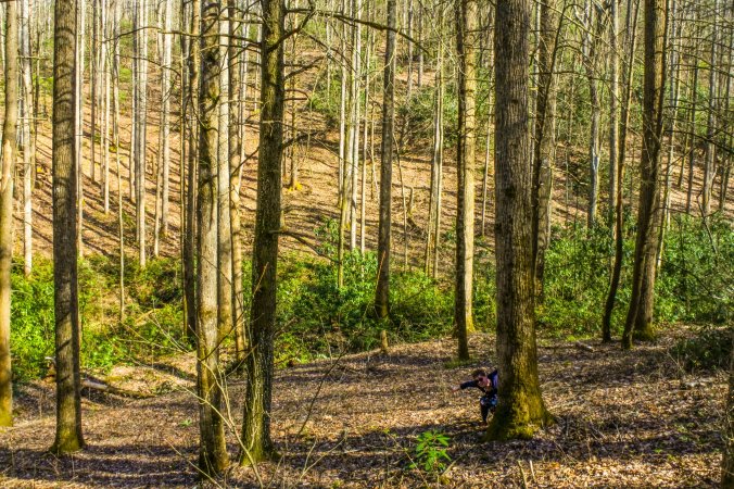 Can’t see the pees for the wood. Here’s Lizzy in Piss-gah National Forest, NC, USA.